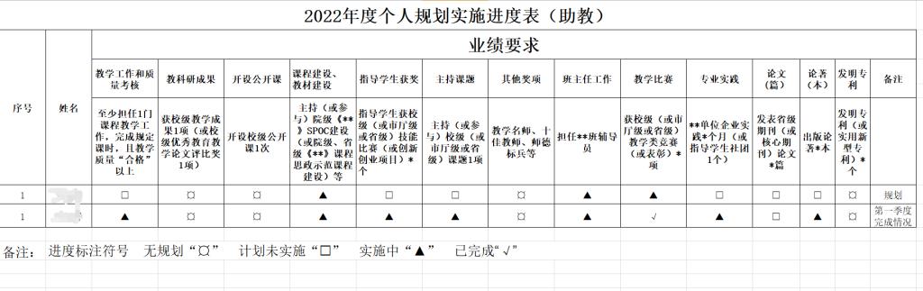 为推动教师教学能力及业务水平的提升,基于《基础部(体育部)教职工量化考核办法(试行)》的相关内容,基础部(体育部)全体教职工从教育教学、专业实践、代表性成果等三个方面制订了2022年的个人规划。3月28日—4月1日,以教研室为单位开展了第一季度个人规划实施情况的督查。从督查结果来看,一季度个人规划的总体进展顺利,全体教师已基本建立“目标-实施-反馈”的习惯,个人规划的制订与实施对促进教师参加教学比赛、参与培训提升以及申报课题等起到了很好的作用,同时营造了积极向上、互相激励、共同进步的良性竞争氛围。