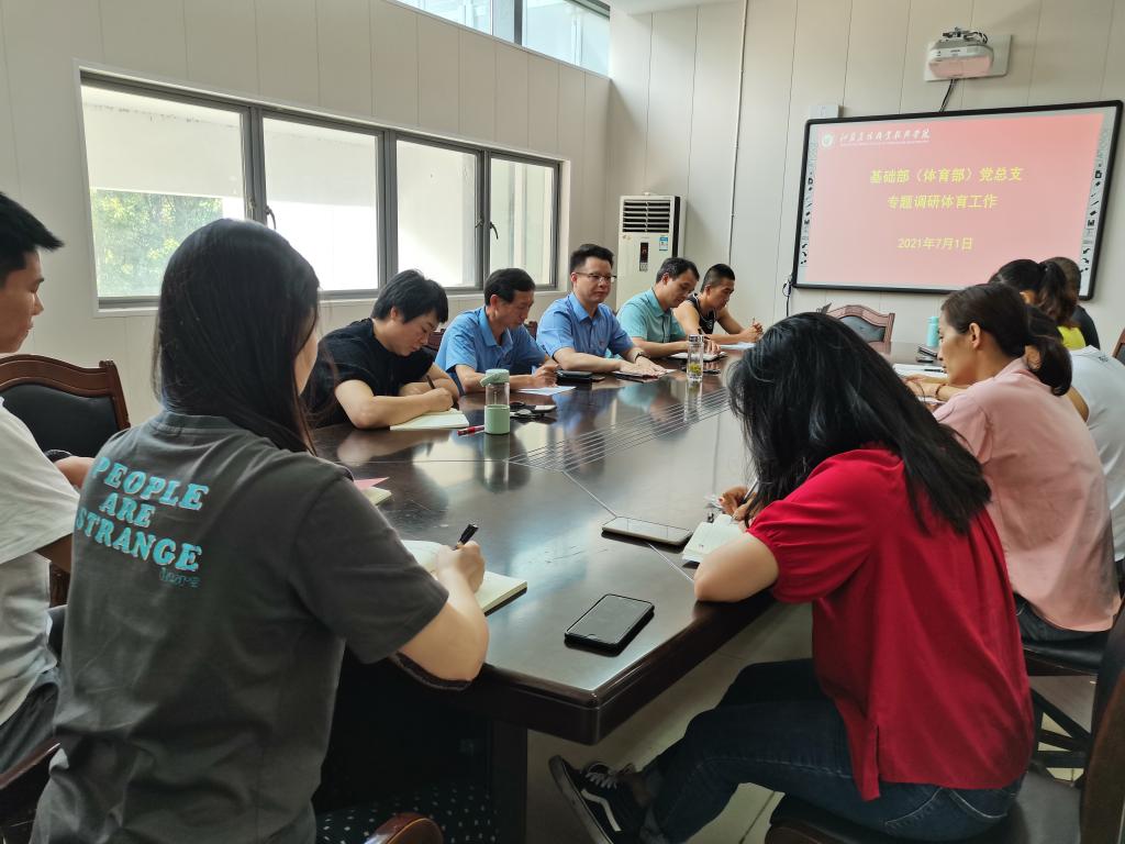 7月1日,基础部(体育部)党总支在体育馆会议室召开专题调研体育工作座谈会,基础部(体育部)党总支副书记郭俊主持会议,体育教研室和群体竞训教研室部分体育教师参加会议。