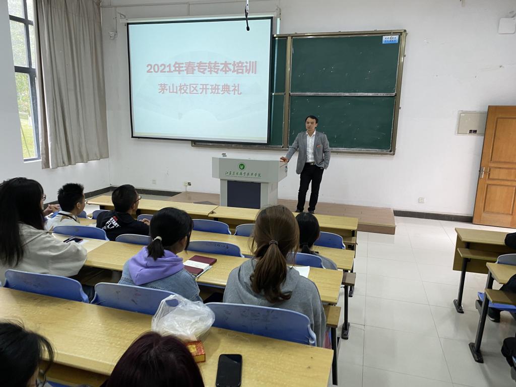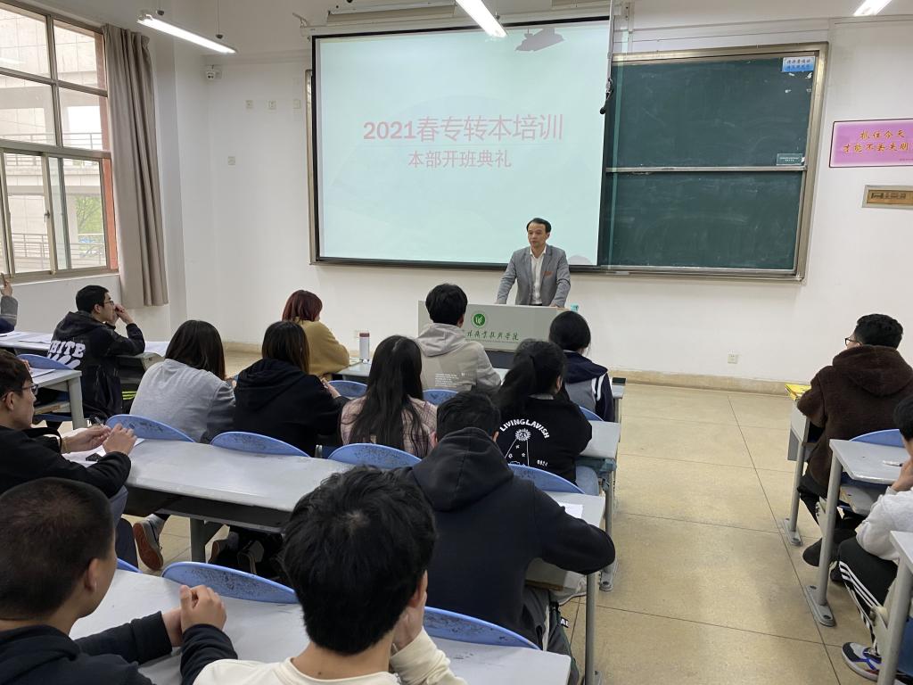 2021年4月7日下午,基础部于茅山校区、本部校区分别举行了2021年春专转本培训班开班典礼。基础部副主任黎明出席了开班典礼,两位班主任及全体学生参与,此活动由王蓓老师主持。