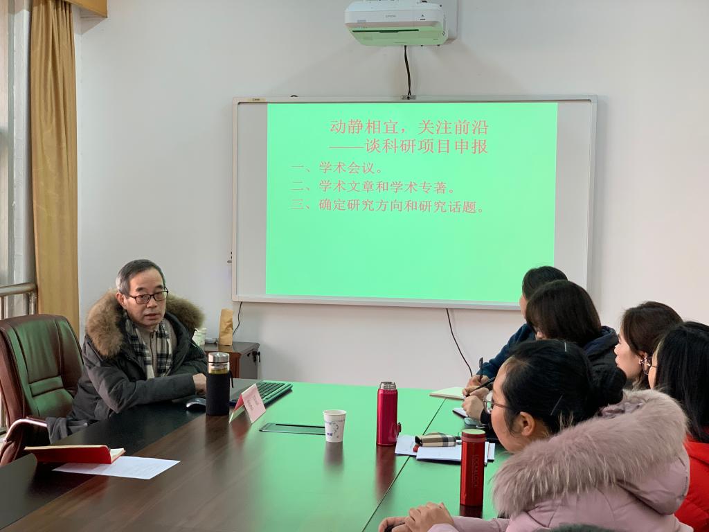 1月20日上午,马克思主义学院邀请河海大学外国语学院蔡斌教授来我院做科研课题申报专题讲座。全体英语教师参加了此次活动。