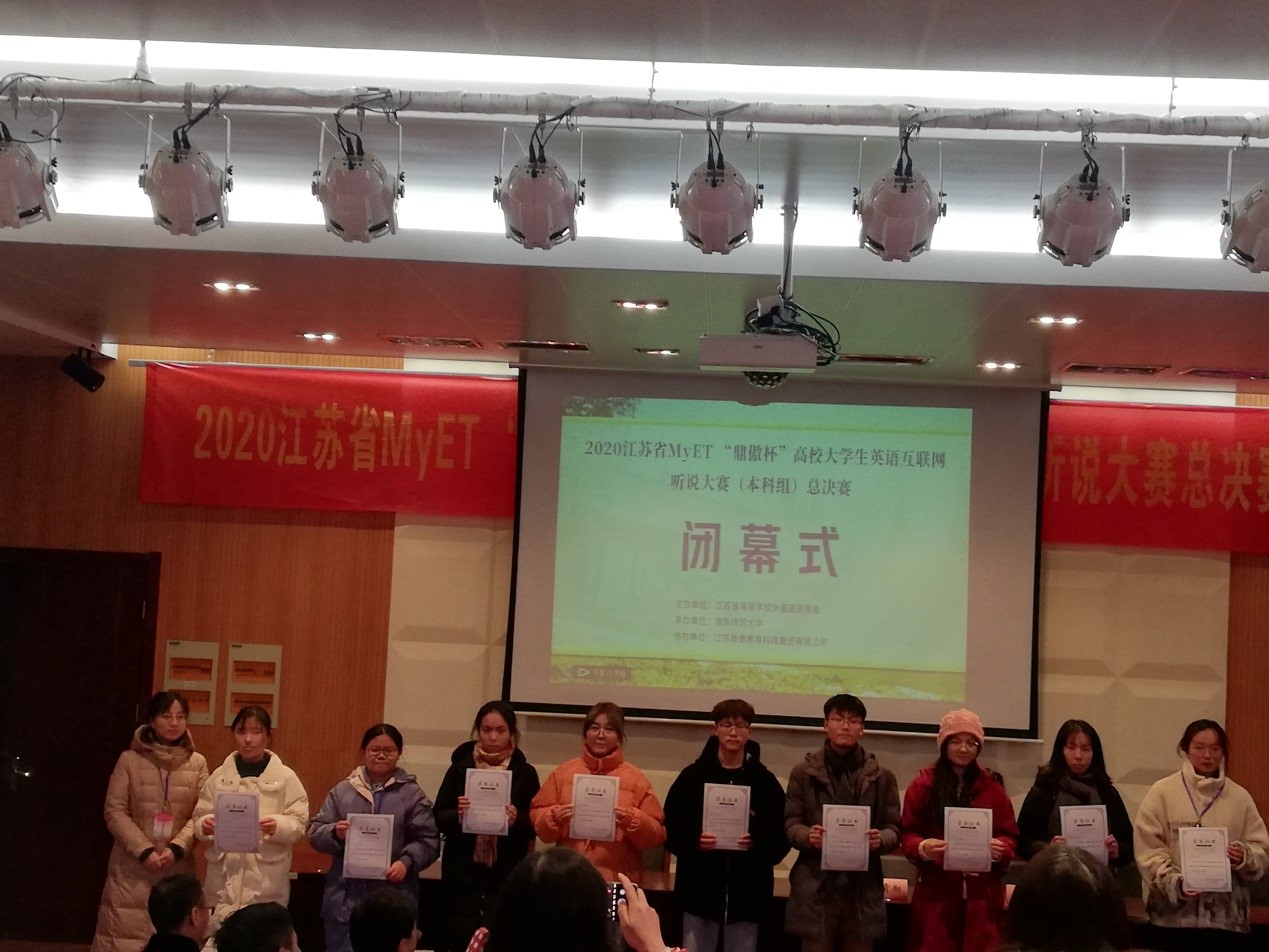 2020年12月30-31日,江苏省MyET“鼎傲杯”高校大学生英语互联网听说大赛(本科组)总决赛于南京师范大学隆重举行。我院19物联网(4+0)祁游同学和20物联网(4+0)刘连席同学均喜获二等奖,杭宏老师和许敬琳老师获优秀指导老师奖。
