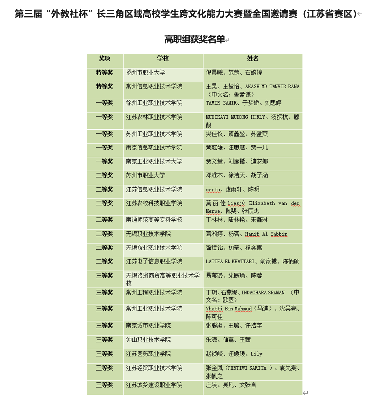 12月8日, 第三届“外教社杯”长三角区域高校学生跨文化能力大赛暨全国邀请赛(江苏省赛区)比赛省赛评审工作在东南大学九龙湖校区举行,此次比赛吸引了全省近60所本科和高职院校的参赛团队。我院学子汤振杭、滕靓及刚果留学生MUBIKAYI MUHONG HORLY在郭俊老师和戚燕丽老师的指导之下取得了高职组一等奖的好成绩!