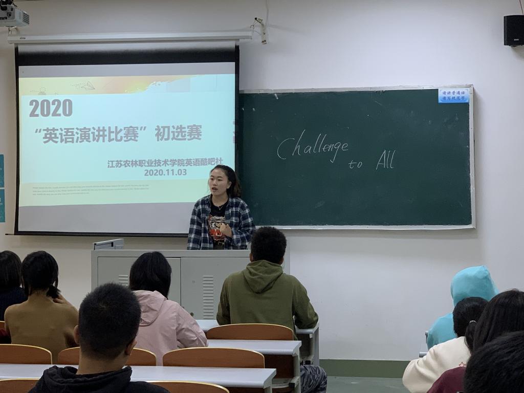 由马克思主义学院“英语酷吧社”社团、共青团江苏农林职业技术学院委员会主办的“英语演讲比赛”初赛于11月3日下午在我院成功举办。本次比赛为我院参加外语教学与研究出版社和中国职业外语教育发展研究中心联合主办的2020“外研社·国才杯”全国英语演讲大赛而举行的校内初选活动,旨在为大学生提供展示风采、实现自我的广阔舞台,为外语教学创设融通中外的改革契机。